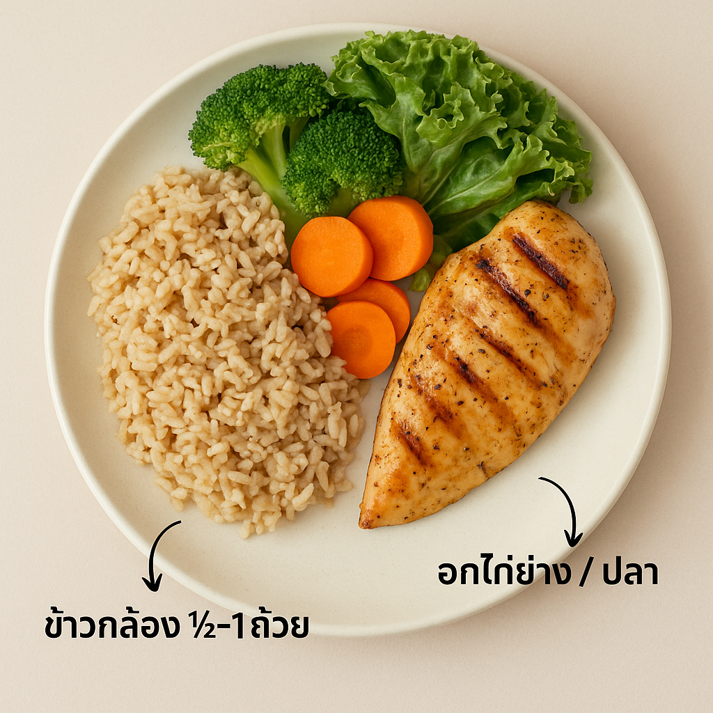 สลับเป็น: โปรตีนไม่ติดมัน ปลา ไก่ไขมันออก–คู่กับผัก/ถั่ว/ธัญพืชทุกมื้อ